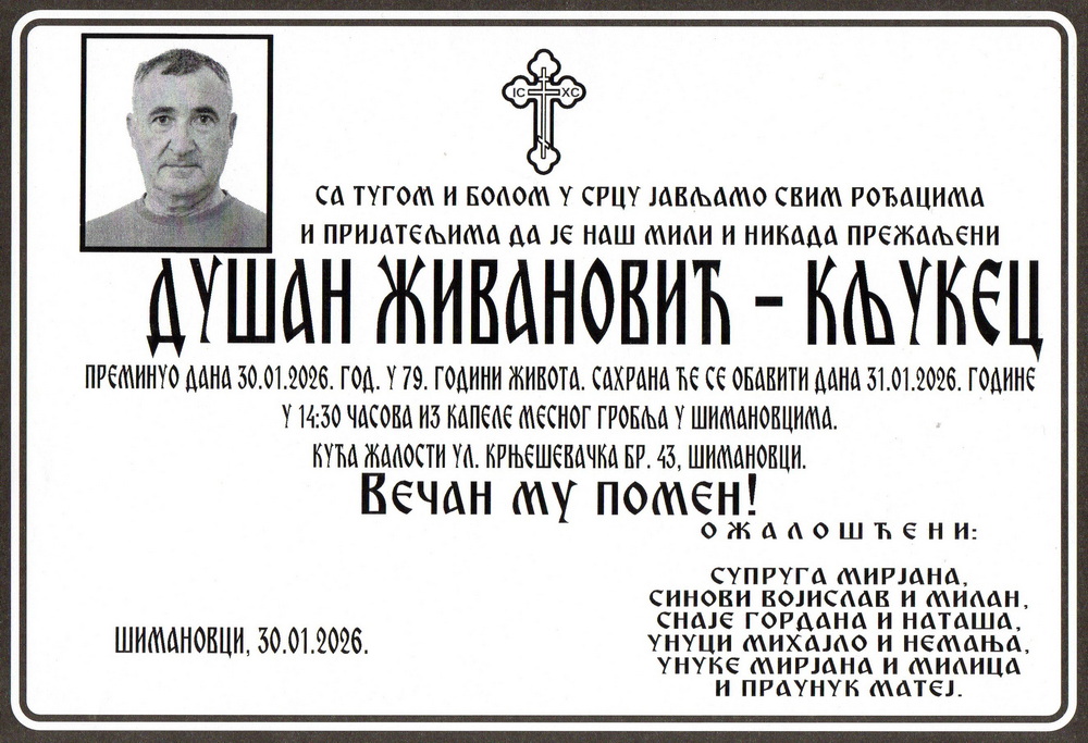 Јутрос 30. јануара 2026. године у болници на Бежанијској Коси преминуо је Душан Живановић – Кљукец пензионер из Шимановаца. Душан је живео у улици Крњешевачкој број 43 у Шимановцима. Рођен је 02. септембра 1947. године у Шимановцима. Оженио се Мирјаном са којом је добила два сина; Војислава и Милана. Сахрана Душана Живановића биће обављена сутра у суботу 31. јануара 2026. године. Скуп је од 13.30 часова испред  капеле у Шимановцима. Опело ће почети у капели у 14.30 часова и Душан ће бити сахрањен на шимановачком месном гробљу.