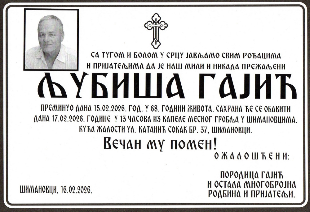 Јуче ујутро 15. фебруара 2026. године у болници на Бежанијској Коси преминуо је Љубиша Гајић пензионер из Шимановаца. Љубиша је живео у улици Катанић Сокак број 37 у Шимановцима. Рођен је 20. маја 1958. године у Шимановцима. Оженио се Снежаном са којом је добио два сина: Ненада и Предрага (+2017). Сахрана Љубише Гајића биће обављена сутра у уторак 17. фебруара 2026. године. Скуп је од 12.00 часова испред капеле у Шимановцима. Опело ће почети у капели у 13.00 часова и Љубиша ће бити сахрањен на шимановачком месном гробљу.