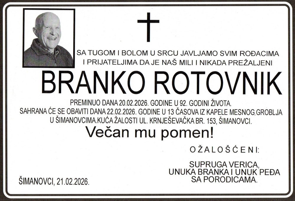 Касно синоћ 20. фебруара 2026. године у болници у Земуну преминуо је Бранко Ротовник пензионер из Шимановаца. Бранко је живео у улици Крњешевачкој број 153 у Шимановцима. Рођен је 27. септембра 1934. године у месту Пака при Велењу – Велење Словенија. Оженио се Верицом са којом је добио двоје деце: ћерку Силву (+2025) и сина Милорада (+2022). Сахрана Бранка Ротовника биће обављена сутра у недељу 22. фебруара 2026. године. Скуп је од 12.00 часова испред  капеле у Шимановцима. Опело ће почети у капели у 13.00 часова и Бранко ће бити сахрањен на шимановачком месном гробљу.
