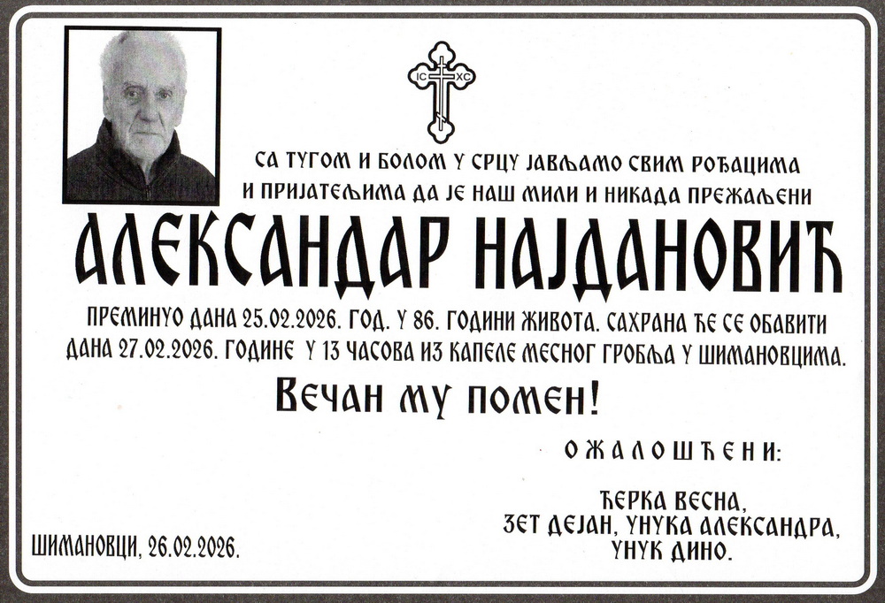 Касно синоћ 25. фебруара 2026. године код ћерке у Јакову преминуо је Александар Најдановић пензионер из Шимановаца. Александар је живео у улици Ново Насеље број 28/2/3 у Шимановцима. Рођен је 02. септембра 1940. године у Београду. Оженио се Миленом са којом је добио четири ћерке: Јасмину, Љиљану, Весну и Мирјану(+2024). Сахрана Александра Најдановића биће обављена сутра у петак 27. фебруара 2026. године. Скуп је од 12.00 часова испред капеле у Шимановцима. Опело ће почети у капели у 13.00 часова и Александар ће бити сахрањен на шимановачком месном гробљу.