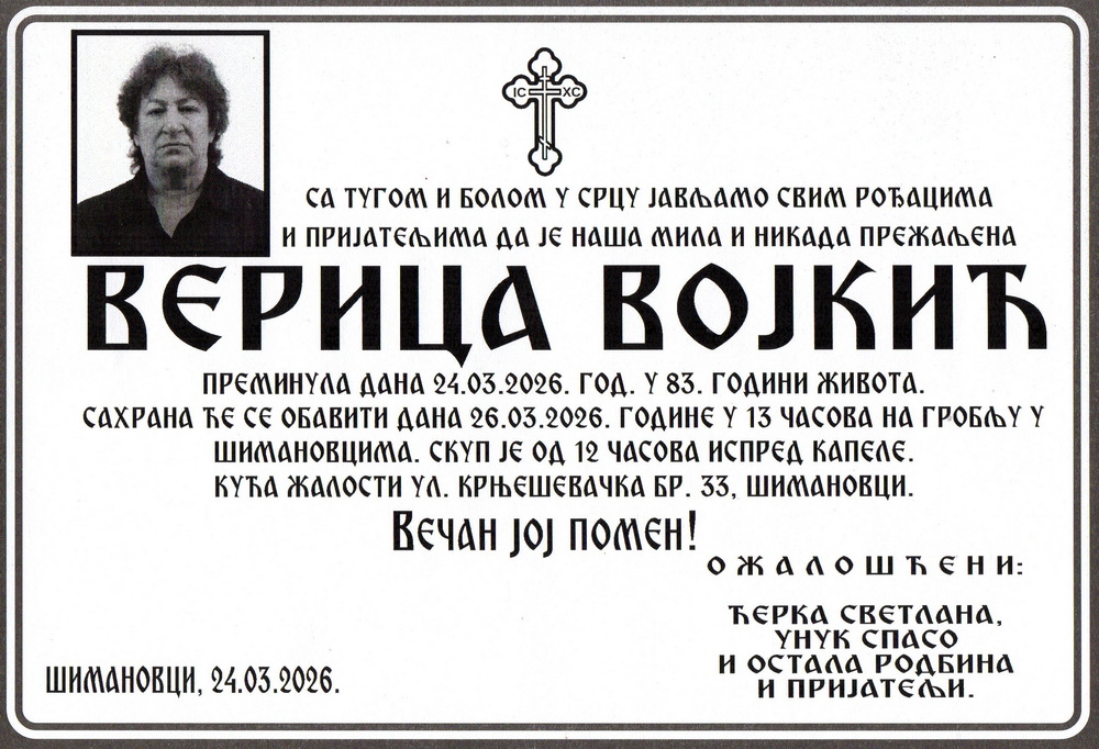 Синоћ 25. марта 2026. године у свом дому у Шимановцима преминула је Верица Војкић пензионер из Шимановаца. Верица је живела у улици Крњешевачкој број 33 у Шимановцима. Рођена је 27. јуна 1943. године у Дечу у фамилији Радојевић. Верица се удала за Здравка Војкића са којим је добила ћерку Светлану. Сахрана Верице Војкић биће обављена сутра у четвртак 26. марта 2026. године. Скуп је од 12.00 часова испред  капеле у Шимановцима. Опело ће почети у капели у 13.00 часова и Верица ће бити сахрањена на шимановачком месном гробљу.
