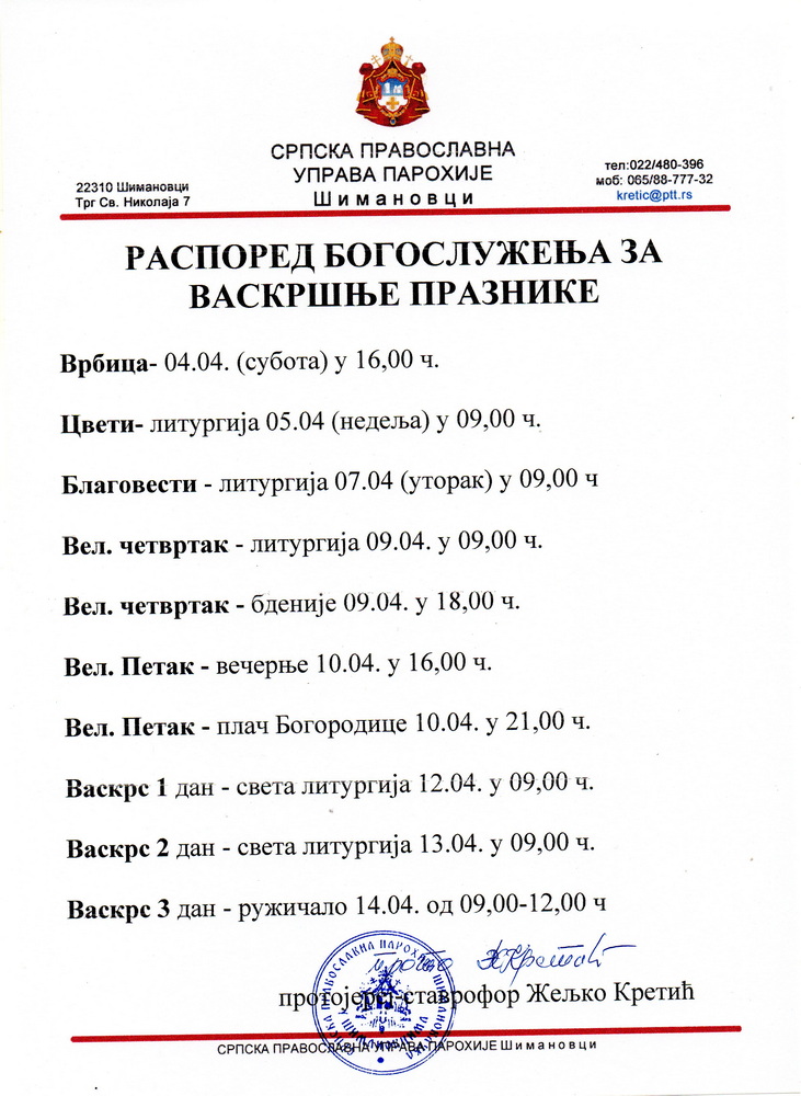 Распоред богослужења за Васкршње празнике – најава